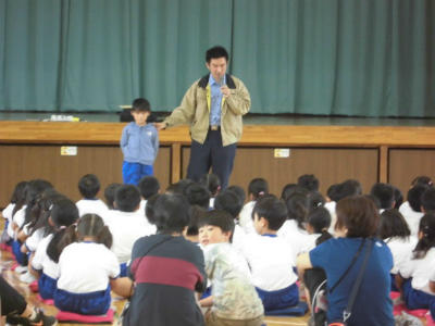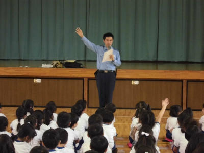 本日の2校時、1年生が防犯教室を行いました。春日部警察の生活安全課2名のおまわりさんが1年生に、不審者への対応を中心にお話しいただきました。