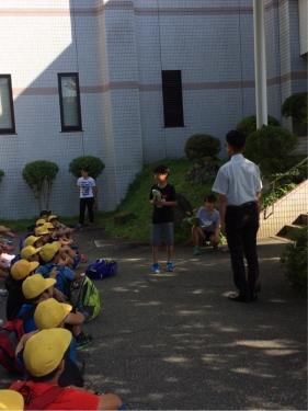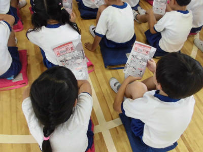 夏休みの生活について、お話を聞きました。火遊びはしないこと、水の事故に注意すること、不審者に注意すること、校外での過ごし方のルールを守ることについて、「4つの車にお世話にならないように…出合わないように…。」と先生が話したので、イメージを持ちながら聞くことができました。