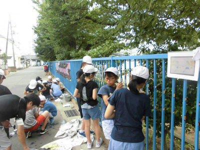 お二人の先生は、午前中から準備を始めています。子どもたちの描いた絵柄をフェンスの幅に合わせて切り、セロテープで留めています。また、カーボン紙を使ってフェンスに印を付けています。