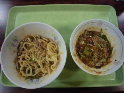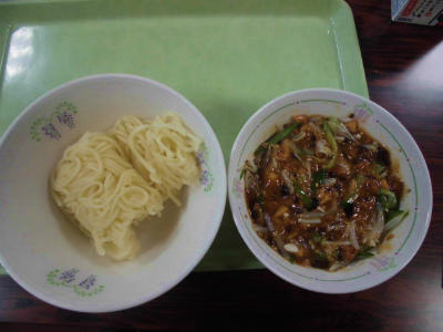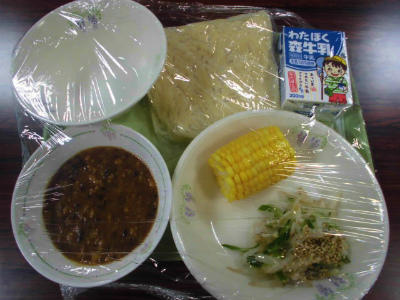 献立 中華麺、肉みそ、野菜、牛乳、ゆでトウモロコシ