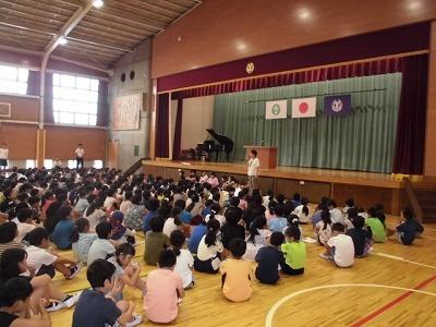 始業式。先生の話を、静かにしっかり聞いている子どもたちの様子です。