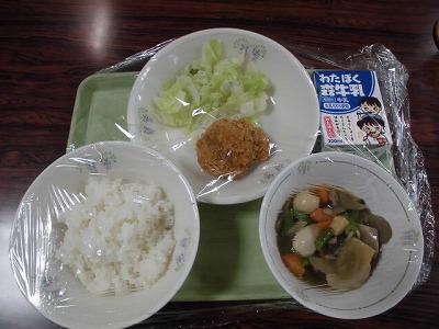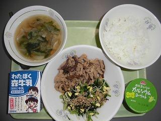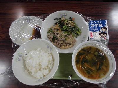 ごはん、牛乳、豚肉のオイスターソース焼き、青菜とかんぴょうの和え物、五目煮