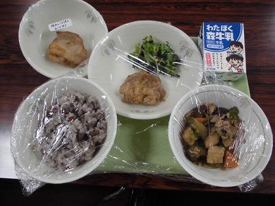 ささげごはん、牛乳、鶏肉のごま焼き、菊の花入りあえもの、厚揚げとなすのみそ炒め、除去はごま抜きの鶏肉でした。おいしくいただきました。