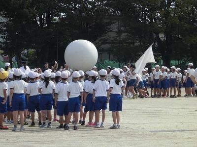 全校児童で行う大玉送りの種目です。きょうは、白組が勝ちました。