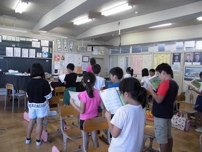 金冠バンドクラブの子どもたちの伴奏に合わせて歌います。クラブの子どもたちは、夏休みや休み時間にも一生懸命練習しています。