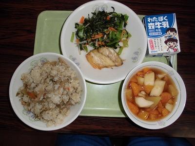 本日の給食は、きんぴらご飯、牛乳、さばの塩焼き、磯香和え、フルーツ杏仁でした。