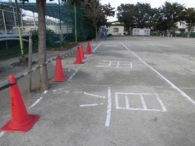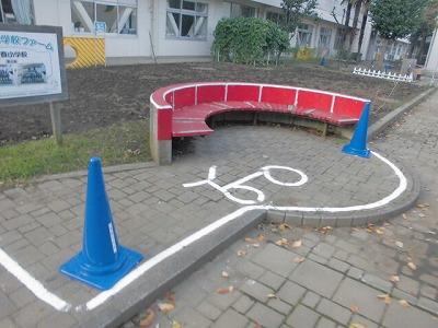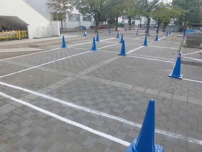 PTA役員の皆様が駐輪場の場所を示してくださいました。正門より離れた場所から停めていただくようご協力ください。奥に自転車を止めると、体育館と校舎の間を通って会場に行くこともできます。