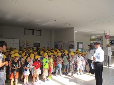 改札の中に入る前にあいさつをしています。駅の方に注目している子どもたちです。