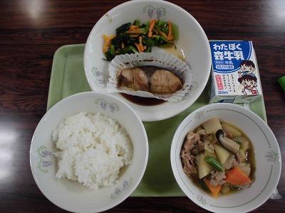 献立は ごはん、牛乳、ブリの照り焼き、三食野菜のおひたし、肉じゃが