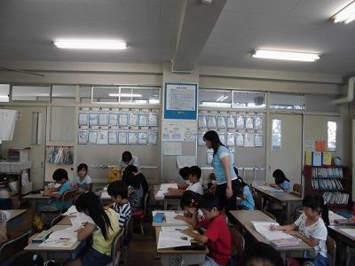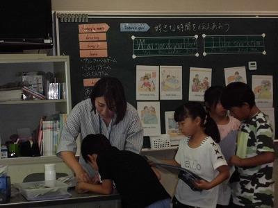 4年生 英語活動の様子です。一人ずつ英語の先生にワークシートを見ていただいています。