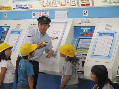 改札の中に入る前にあいさつをしています。駅の方に注目している子どもたちです。