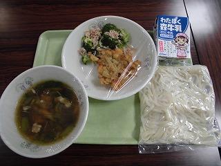 献立は、地粉うどん、ごま汁、牛乳、、かきあげ、ブロッコリーのおろし和え