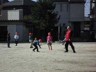 1年生 図工 高く箱を積み上げた子に注目。「キリンみたいだね。」とつぶやく子どももいます。外では、生活科 昔遊び・羽根つきを楽しんでいる子どもたちの姿を見付けました。