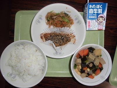 本日の給食は、ごはん、牛乳、さわらの南部焼き、切り干し大根の炒めもの、五目煮でした。さわらの南部焼きは、ゴマの風味が漂い、とてもおいしかったです。