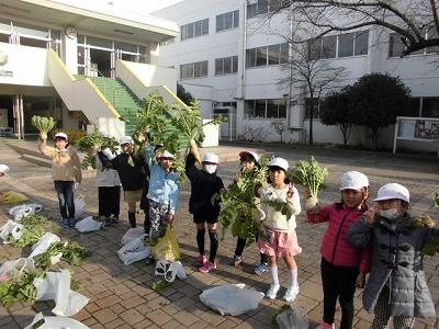 大根やかぶ、赤かぶなどとっても大きく育った野菜を大喜びで収穫していました。自分の顔より大きくなった大根などを見て、「すごーい!」と大きな歓声があがっていました。これまで何度も学校に足を運び、野菜の成長を確認し、育てるコツを教えていただいた地域の学校応援団の方々にお礼を言って終わりにしました。