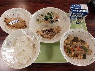 献立 こぎつねご飯、牛乳、ホッケのみりん焼き、白菜のお浸し、根菜のごま風味汁