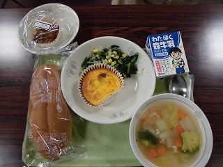 献立 コッペパン、イチゴジャム、牛乳、ミートオムレツ、ほうれん草のサラダ、冬野菜のポトフ