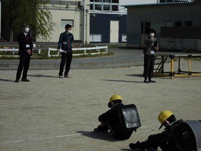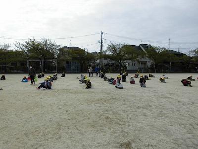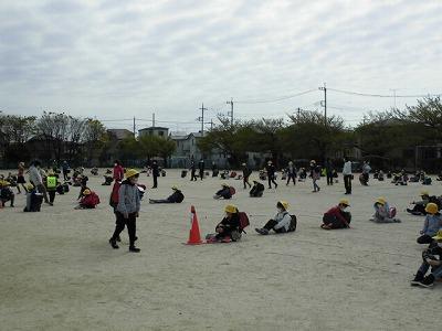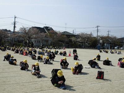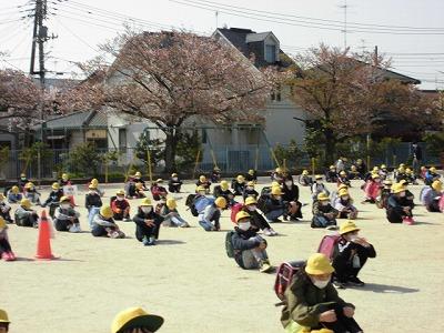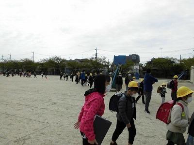 校庭に出て一斉下校。前の人と間をあけて密を作らないように座ってお話を聞きました。