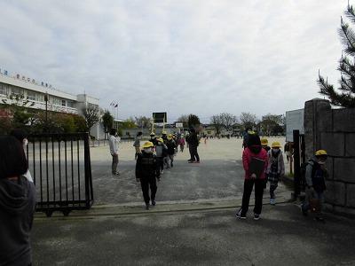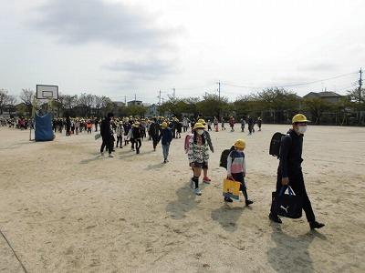 昨日と同じ、一斉下校で帰ります。今日は昨日よりもさらに広く間隔をとり、感染症拡大防止のための措置を取りました。
