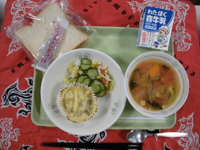 本日の給食7月7日(火)さっぱりした味です ズッキーニとトマトのスープ