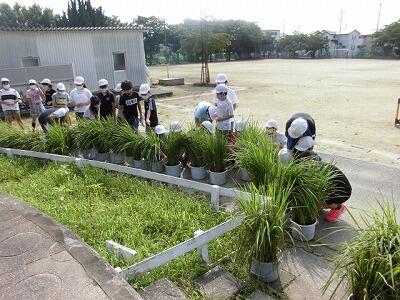 5年生が取り組んでいるバケツ稲の様子です。穂が伸びしっかり成長しており、子ども達もしっかりと観察とお世話を頑張っています。