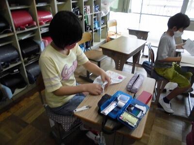 1学期最後の給食の準備中!しっかりナプキン、はし、歯磨きセットを用意します。
