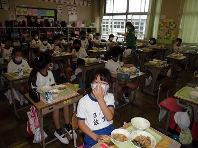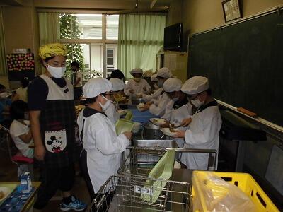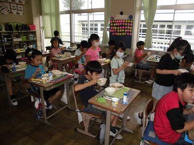 一年生の給食の時間です。みんな配膳がとても早くスムーズにできるようになりました。待ってる児童もすばらしいです。