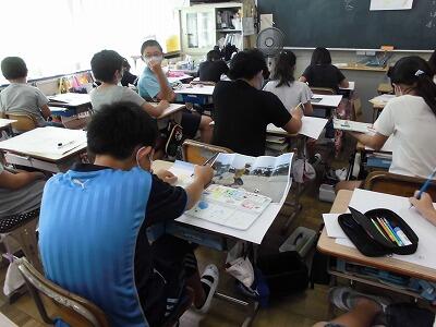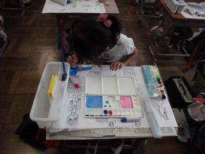 図工では、絵の具を使って色塗りが始まりました。塗り方、色の作り方等、教わったことをしっかりと行っています。