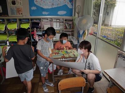 外国語の授業では、絵を見て何の時間か英語で答えるゲームを行っていました。英単語がわからない中で、自分で知っている英語を使って想像豊かな時間をみんな発表することができていました。