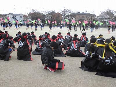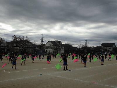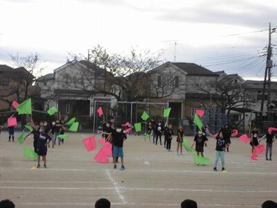 旗を使ったダンスで、みんなが揃うととてもきれいです。緑とピンクのあざやかな旗の動きに注目です。