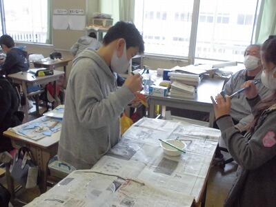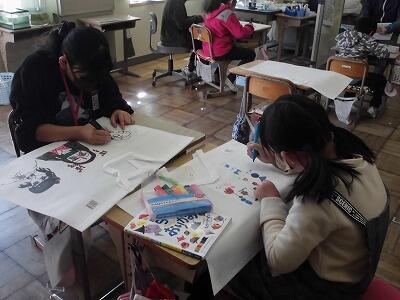 6年生の図工の時間。作品がほぼ出来上がり仕上げに入っています。さすが6年生という作品です。