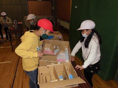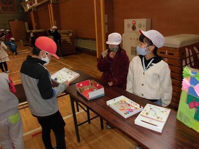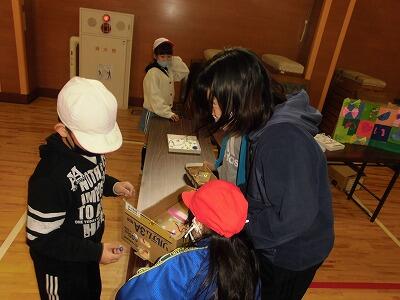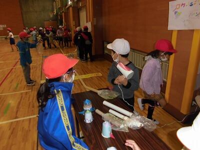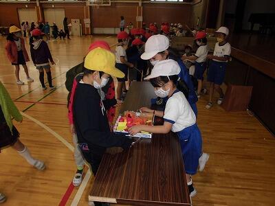 本日の午前中に2年生が「遊びランド」を開催し、1年生がお客さんとなり、いろいろなゲームで楽しみました。これまでに2年生は、生活科の時間に一年生が楽しめる遊びと景品作りを行い、1年生を楽しませる工夫を考えて計画、実行しました。今日の本番は、新型コロナウイルス感染症対策を十分に行い、1年生の一クラスづつ時間を決めて遊びに来ました。