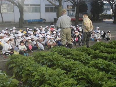 学校応援団の方から、大根やカブが一粒の小さな種からこんなに大きく育つことを話していただいた