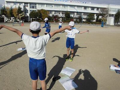 体育の時間では、4年生がなわとびを行っていました。自分の最高記録を目指して取り組んでいます。
