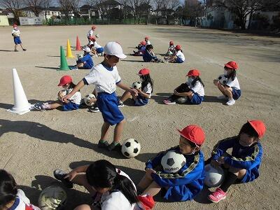 1年生は「ボール蹴りゲーム」を行っています。ボールの操作や的当てなど楽しく授業をしていました。