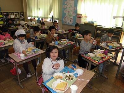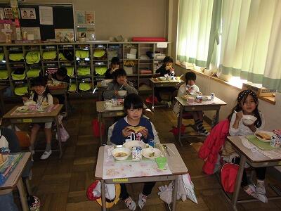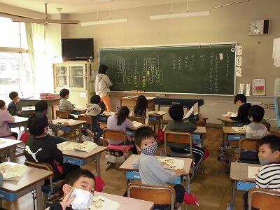 給食の時間はマスクをして、いい姿勢で静かに待つことになっています。1年生はしっかりと待つことができました。