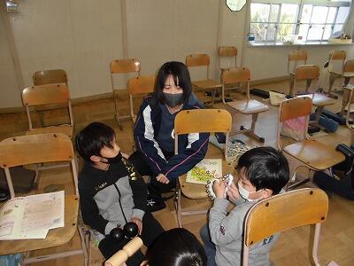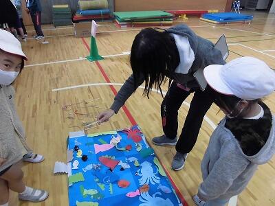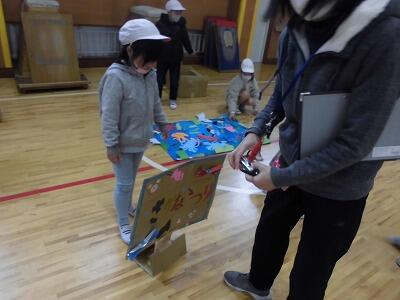 本日の午前中に2年生が「遊びランド」を開催し、1年生がお客さんとなり、いろいろなゲームで楽しみました。これまでに2年生は、生活科の時間に一年生が楽しめる遊びと景品作りを行い、1年生を楽しませる工夫を考えて計画、実行しました。今日の本番は、新型コロナウイルス感染症対策を十分に行い、1年生の一クラスづつ時間を決めて遊びに来ました。