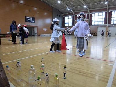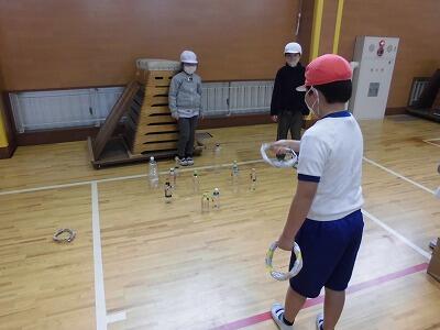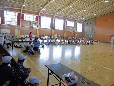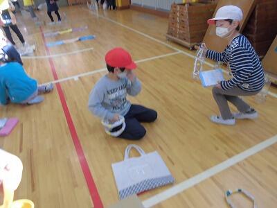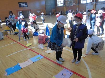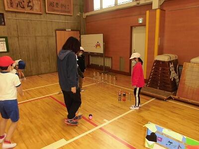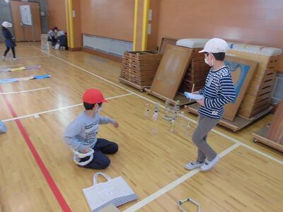 本日2・3校時に、2年生が体育館で「遊びランド」を開催しました。生活科の時間に1年生との交流のために、2年生がいろいろな遊びやゲームを作り、1年生に遊んでもらう会です。今日はその予行ということで、2年生の中で交代で遊びやゲームを楽しみました。