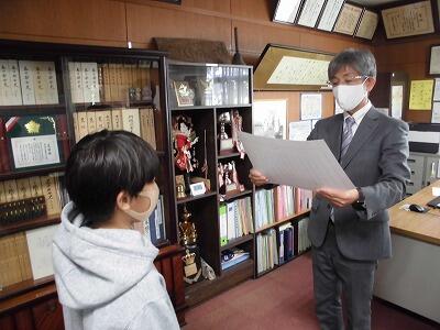 給食の時間を使って、図工の表彰者の呼名をしました。身障展、郷土を描く美術展、薬物乱用防止啓発ポスター展等の入賞者と、校内絵画展についての呼名を行い、昼休みに代表が校長室で賞状を表彰されました。