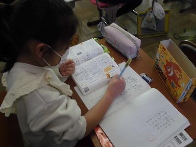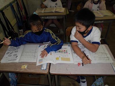 1年生は落ち着いて学習に取り組んでいます。時にはマンツーマンで、時には一斉で工夫しながら学習を進めています。