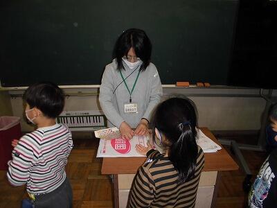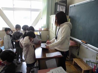 1年生は、算数の問題を個別に問題を解いて先生と確認しているところです。