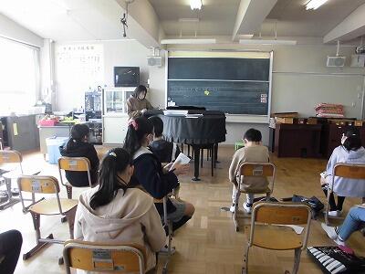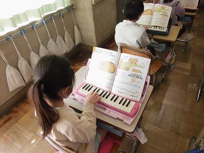 2年生の音楽では、担任の先生の伴奏に合わせ、鍵盤ハーモニカの指の使い方を練習しています。音を出すことができないため、工夫して音楽の授業に取り組んでいます。