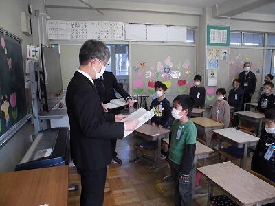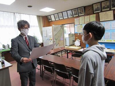 朝の放送で、3人の先生から、頑張った児童の表彰の発表をしてもらいました。表彰は昼休みに校長室で行いました。
