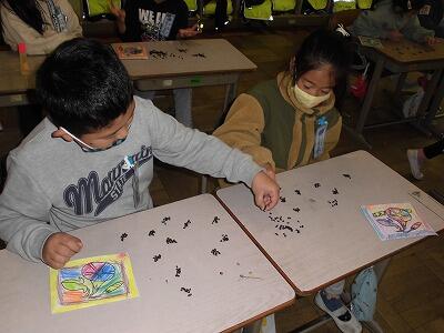 2年生の図工では、ビニールと型をを組み合わせて、くまさんやウサギさんなど自分の思いの作品をつくっています。