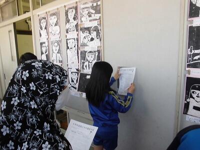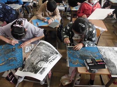 4年生は、鑑賞の時間で友達の版画の作品にコメントを入れていました。