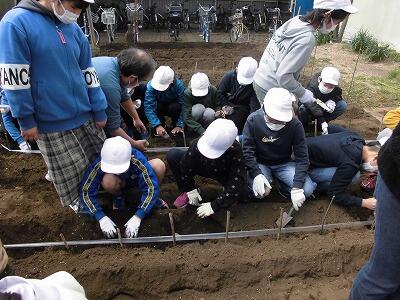 学校ファームでは、来年度に向けて5年生がジャガイモの種植えを行いました。地域の学校応援団の方のご指導の下、元気なジャガイモが育つことを願ってしっかりと植えることができました。