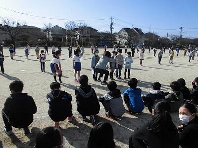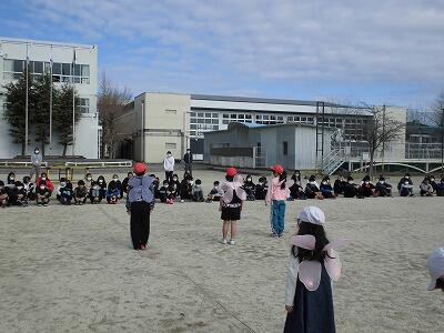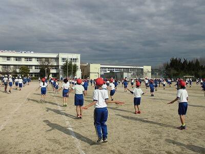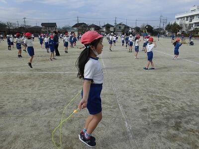 令和2年度最後の体育朝会は、1・3・6年生で行いました。種目はなわとびの時間跳びです。1年生は1分間、3年生は3分間、6年生は5分間を目標としてチャレンジしました。