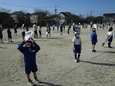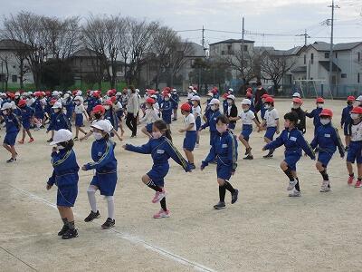 校庭には1年生が待機していて、6年生が集まった後、代表が1年間のお礼の言葉を述べ、ダンスを行いました。