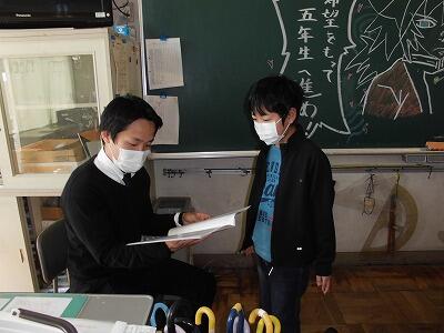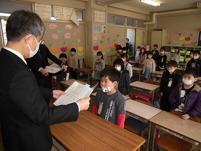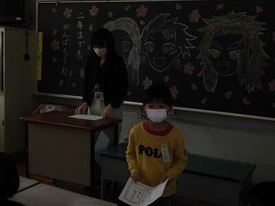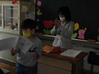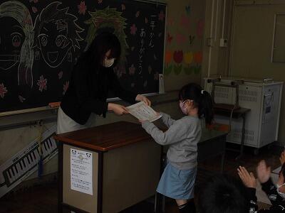 始業式が終わり、いよいよお待ちかねの通知表の配布です。こどもたちは、ドキドキしながら担任の先生から言葉をもらいながら修了書を受け取りました。
