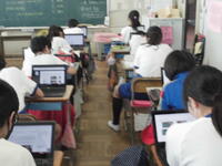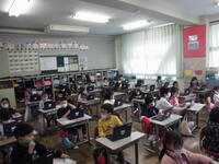 学級の全員で、タブレットの活用、図工の鑑賞、算数の課題解決に取り組む子どもたち